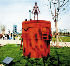 深圳雕塑家戴耘的作品《巡航》在世博会C片区展出。 深圳特区报特派记者 王小可 摄  深圳雕塑家夏和兴的作品《守望的人》。 深圳特区报特派记者 王小可 摄