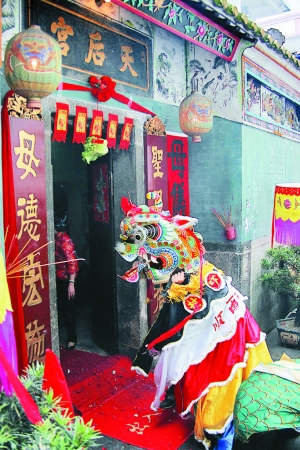 昨日,沙头角中英街内的围墙隔不断沙港两地人民同享节日的欢愉,他们用敲锣打鼓、舞麒麟舞龙、贡祭品、招待八方来客免费品尝“九簋菜”等流传已久的民俗方式共同纪念妈祖诞辰1050周年。
