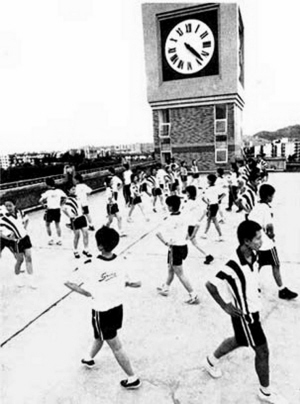 1998年5月13日,深圳高级中学学生在排练校园集体舞,准备迎接深圳市