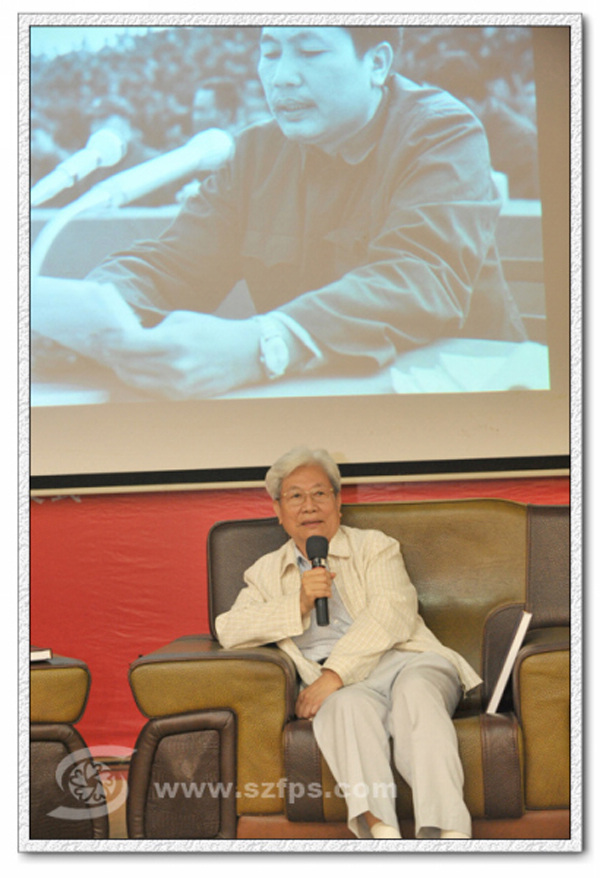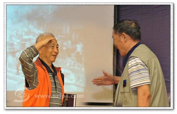 深圳市前革委会副主任李定同志(左一)向何煌友会长致敬