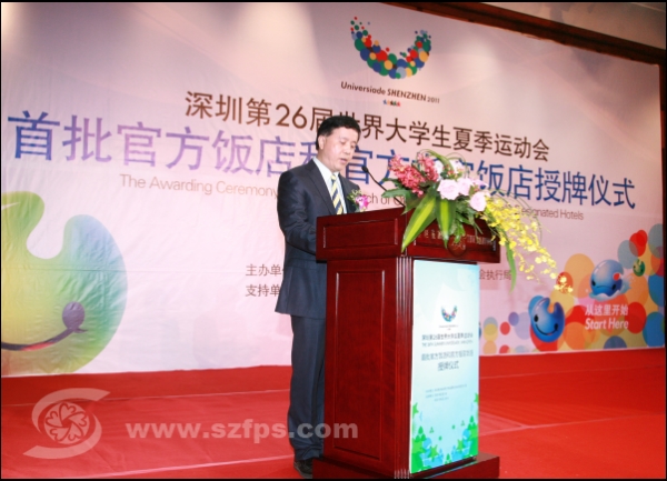 大运会执委会副主席、执行局局长梁道行出席授牌仪式并讲话。他表示,大运会是深圳经济特区成立三十年来首次举办的国际综合性体育赛事,希望获评的27家饭店能够秉承服务大运会的热情,以高度的主人翁意识和社会责任感,扎实有效、耐心细致地做好各项准备工作和服务接待工作。