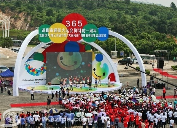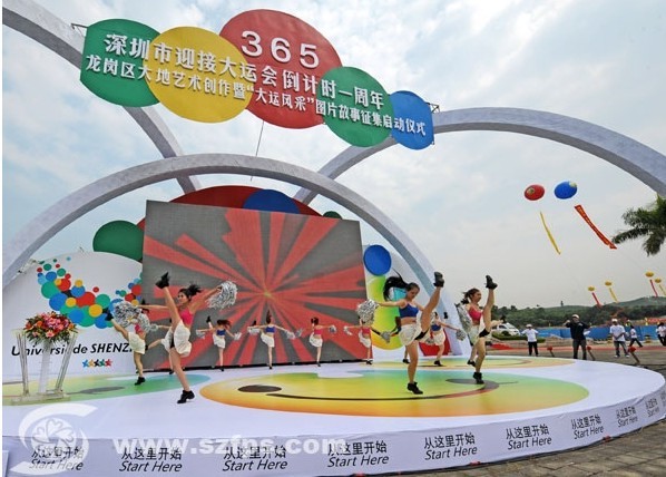 2010年8月12日是深圳2011年世界大运会倒计时一周年的日子。为迎接和展示龙岗区全民参与迎大运氛围,8月5日上午在龙岗区体育中心全民健身广场隆重举行“龙岗区大地艺术创作暨‘大运风采’图片故事征集活动”启动仪式。