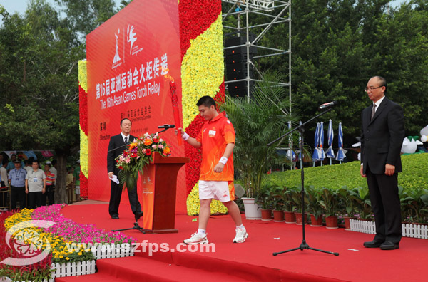 10:53,多哈亚运会男子花剑团体冠军吴汉雄将圣火传递给总政歌舞团独唱演员谭晶。圣火由此进入莲花山风筝广场