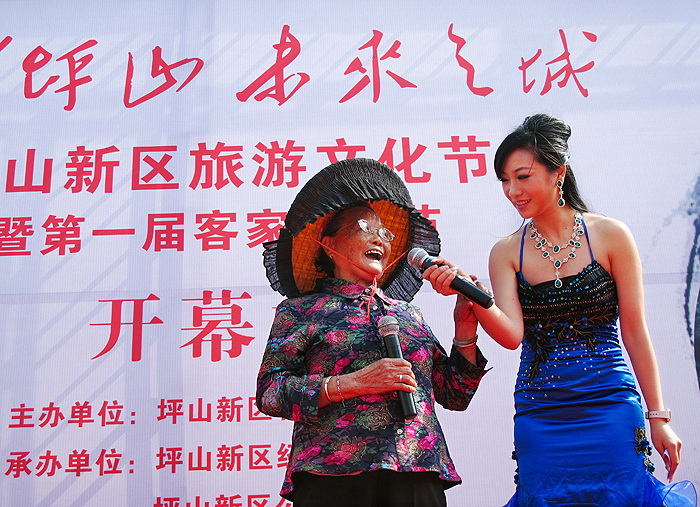 坪山新区的客家妹载歌载舞庆贺“坪山新区旅游文化节暨笫一届客家茶果节”