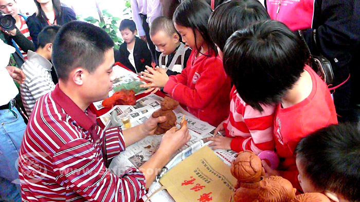 本届交流会他不仅带来了他精心制作的作品《开火车》,还演绎了泥人制作的过程,并进行详细的讲解,同时分享了他自学泥塑艺术的成长历程,最后更邀请现场好奇的小朋友一起制作泥人,倾心传授,耐心指导。