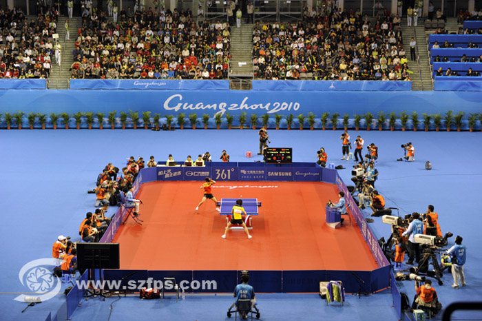 2010年11月20日晚上7点,亚运会乒乓球男子单打决赛、女子单打决赛在广州新体育馆举行,现场观众席座无虚席,拉拉队欢呼声此起彼伏。