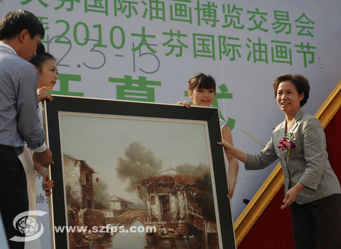 图为开幕式上,深圳市龙岗区人民政府向人民大会堂管理局赠送精美的大芬油画