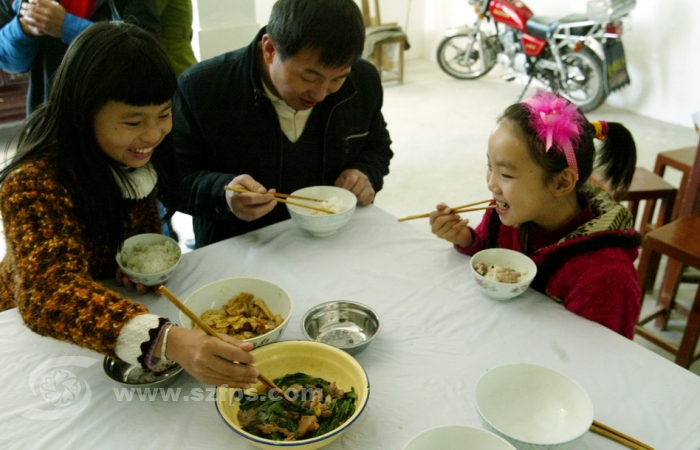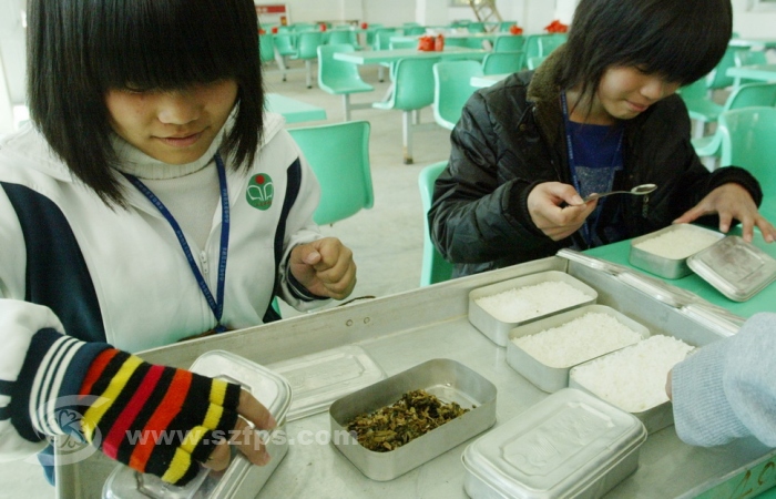 午饭时间到了,笔者随即到学生饭采访。胡副校长对笔者说:由于学生家庭都比较困难,学校虽然有较好的饭堂,但目前还做不到开学生食堂让学生买饭吃。学生都是从家里带米、带菜干在学校的提供的蒸炉里自己蒸饭。只见所有学生都是从按照男女生分开的蒸炉里取出饭盒,从塑料袋中取出从家里带来的咸菜或菜干送饭。笔者尝了一位13岁初一女生的菜干,一点油水也没有,又苦又咸。笔者问她:只有这一个菜吃吗?她点点头说:是啊,可以吃饱就行啦。另一张餐桌上,一位女生正打开一个真空包装食品。笔者走进一看,是一包梅菜加工的咸菜。笔者问她买这样一包要多少钱?她立即礼貌的站起来答道:五毛钱,一包可以吃两顿。在饭堂吃饭的学生,都是13到15岁的孩子,都是青春年少正在发育的年龄,却都是小脸蜡黄,没有一个显得面带红晕,没有一个白白胖胖的。所有的学生都是清一色的米饭加菜干或咸菜,竟没有一个有汤喝的。光吃饭不喝汤行吗?笔者问一位男生。男生似乎觉得笔者提问有点奇怪,反问笔者说道:有开水喝还不行吗?学校免费提供呐。笔者边看边联想深圳许多需要减肥的孩子们,不知是同情还是羞愧,一时竟不知道怎样回答他。