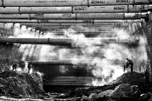 细看钟致棠的摄影作品,既有充满新闻摄影风格的纪实类作品,也有带着“艺术范儿”的诗意作品,比如一幅题为《雕琢》的作品,钟致棠用俯拍的巨幅,拍下工人在地下铲泥时肩膀上的肌肉曲线,远远望去,很像一座人像雕塑。又如一幅题为《工地晨韵》的作品,画面上方的数根橘红色管道之下,斑驳的阳光照进飘散着尘土的地下隧道,几位正在专注施工的工人成为这幅和谐画面上不可或缺的一部分。