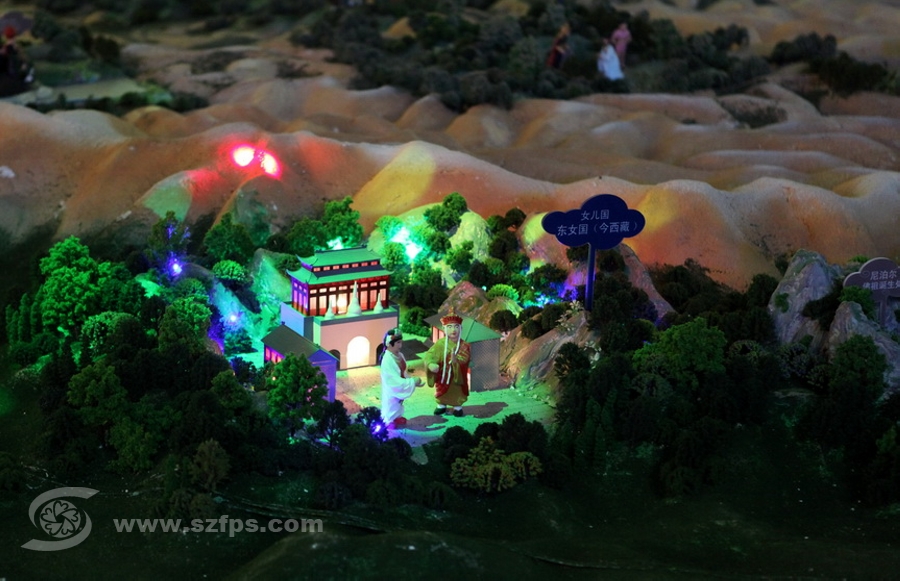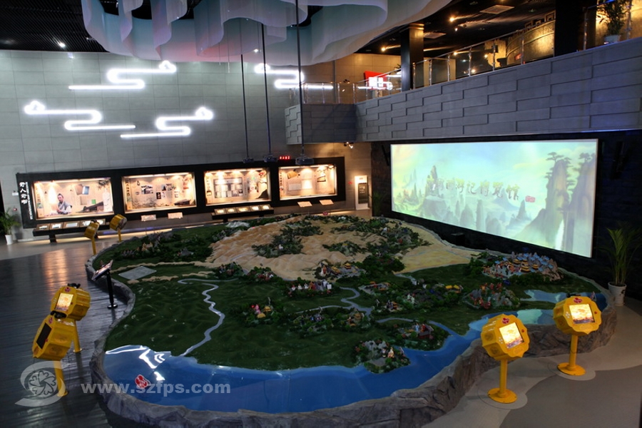 进入馆内,首先看到的是《西游记》历史原型沙盘,面积200多平方米,沙盘内完整呈现着唐僧取经所经过的中国和中亚、南亚各地的地形地貌,重点展示了其中45个主要故事点,。沙盘前的触摸屏上标注了花果山、火焰山、通天河等15个主要故事发生地,参观者只要在屏幕上点击想了解的内容,沙盘上相应区域的灯光就会亮起,沙盘背后的超大屏幕上便会显示相应情景的电视画面,内容生动、直观而丰富,让人顿感身临其境。