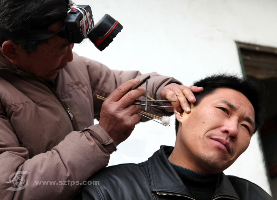 说起他家乡传统的理发业,他说:以前都是挑着担子走乡串户,那担子就像老百姓说的“剃头挑子一头热”,一头是炉子,烧热水给客人修面、洗头;一头是个小木柜,既是客人坐的凳子,也是剃头匠的工具箱。后来,温州发廊铺天盖地,追着乡村集市去摆摊的剃头匠要么找门面开理发店,要么就改了行。发廊里的小妹修面都不老练,更不会掏耳朵。我没钱开店,摆摊剃头又没生意,就把乡下剃头之后捎带着给人掏掏耳朵的活儿当成一门生意来做,苦是苦一点,但是没有多少人跟我抢,因为现在年轻人看不上掏耳朵这活儿,也吃不了学艺的苦。