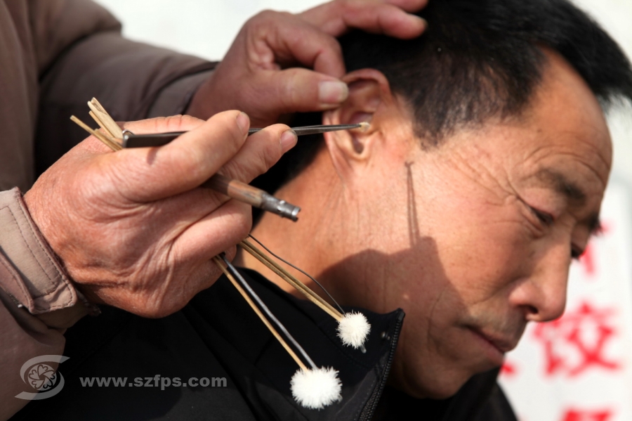 2011年春节前夕的一天中午,浴着冬日暖暖的阳光,我走出淮安汽车站等待同学来接。忽然,看到车站出口附近小餐馆门前居然有一个“专业掏耳朵”的广告。一位50来岁的师傅,头戴LED聚光灯,手握铰刀、挖勺、钩子、镊子、毛球刷等工具,聚精会神地为客人掏耳朵。客人的头偏向一边,眼睛眯缝着,看不出是痛苦还是享受,那表情让我想起某寺庙里啼笑皆非的济公塑像。