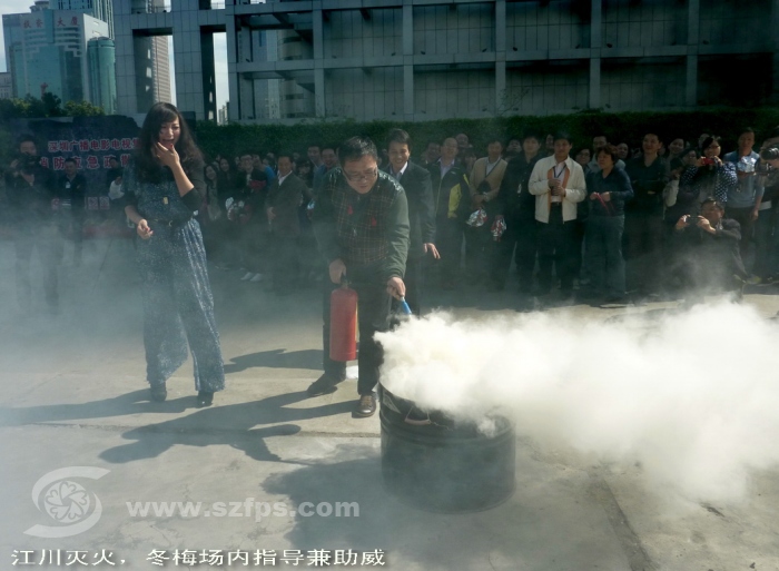 撤到楼下,人们挤在在停车场,找人的、打电话的、拍照的、发微博的都有,场面比赶集还要热闹。后勤部门进行了气体、干粉等灭火器的使用教学演示。但是,有些灭火器气压不足,被大家称为“前列腺发炎”、“疲软的灭火器”。