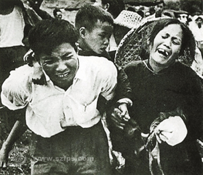 1962年,大批逃港者涌入香港,被香港警方拦截后遣送回来。图为一妇女被遣送时与丈夫告别的悲苦凄惨情形。