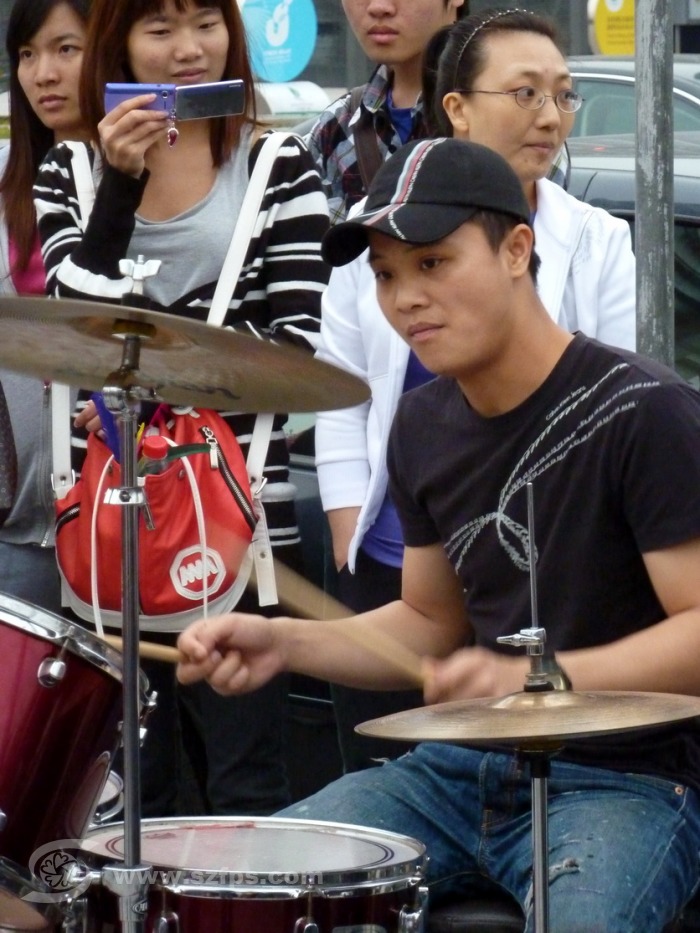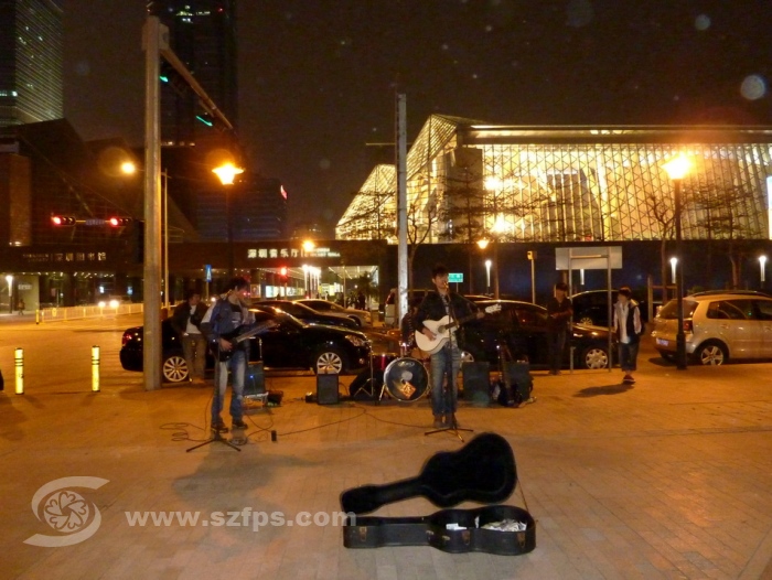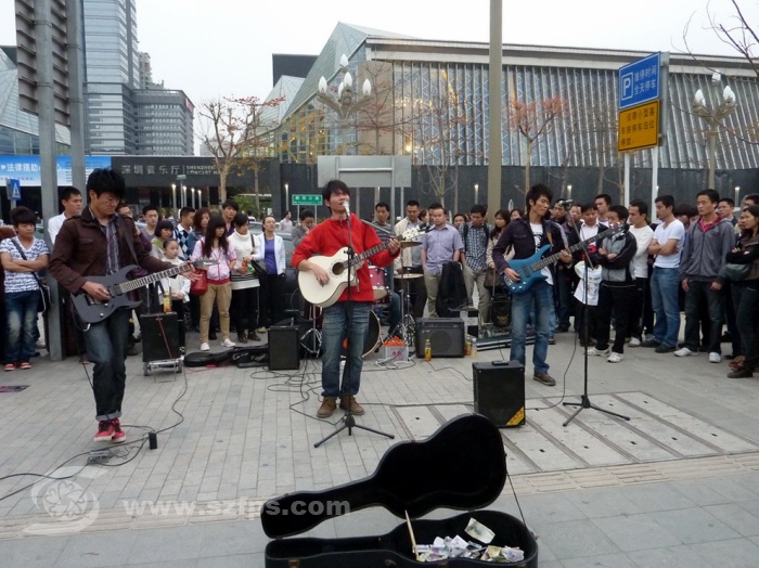 每逢节假日和傍晚,市民中心北侧。音乐厅东边就成了深圳街头音乐的集中地。据几乎每天下班就来广场散步的市民中心工作人员吴先生说,这里晚上基本上都有4-5个乐队或个人在这里演奏或演唱,逢节假日还会翻倍增加。其中,阵势比较大、人气比较旺的要数原上草乐队了。