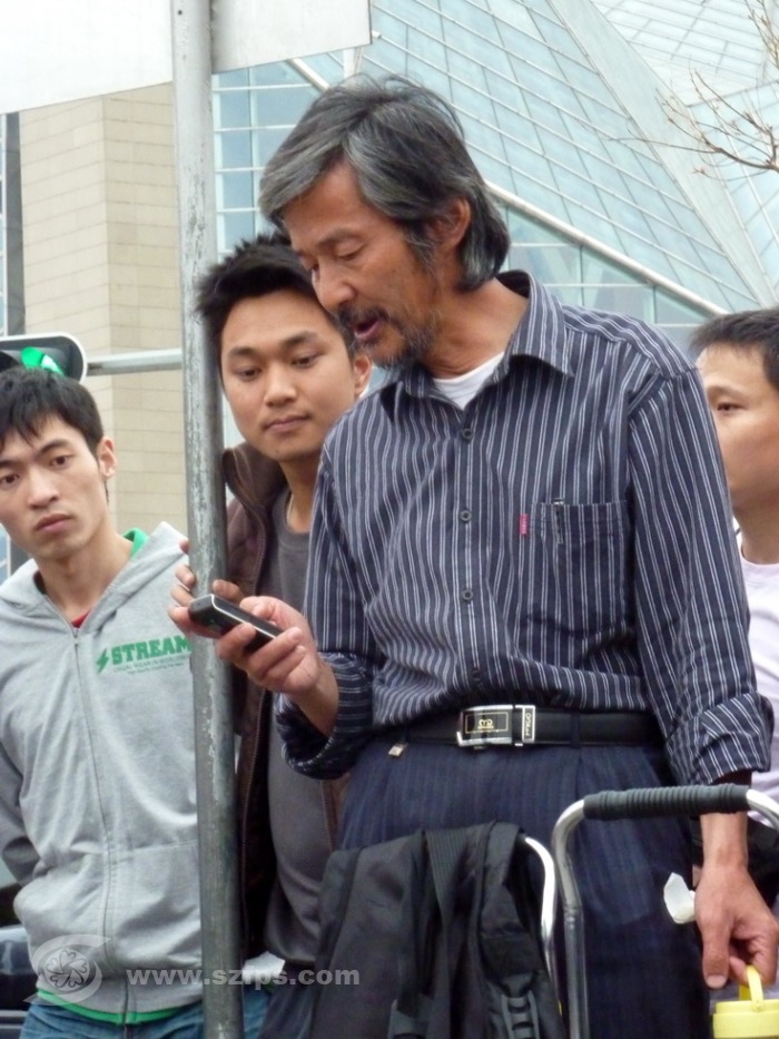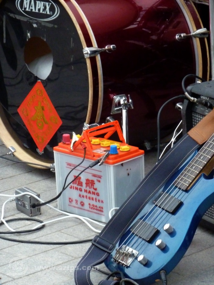 尽管这支乐队比较草根,和近在咫尺的音乐厅的演出可谓天上地下,但是他们演唱的内容符合潮流和大众口味,观众还可以点歌,充满自娱自乐的群众文艺的味道,很受市民喜爱。不过,吴师傅也说,这个乐队也就是人气旺,赚钱好像还不如旁边拉二胡的小盲童。说到收入,我看了一下他们充当钱箱的琴盒,里面五元十元居多,装了小半箱。据说,乐手一个月也就能可以赚到三四千元生活费。