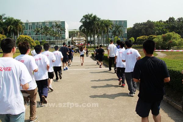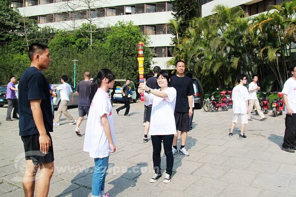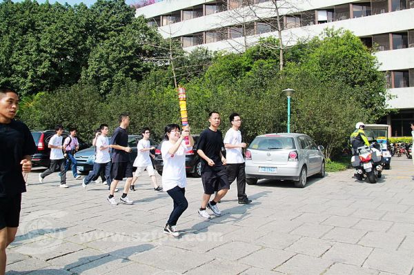 演练有条不紊,先是领导致辞,然后圣火护卫队及火种护卫队上场、点燃火炬。随着领导宣布传递活动开始,75名模拟火炬手在圣火护卫队的护卫下,从深大图书馆出发,沿校园内跑完约三四公里的路程,每人跑了四五十米。而这一路线,基本上就是5月10日火炬传递的实地路线。
