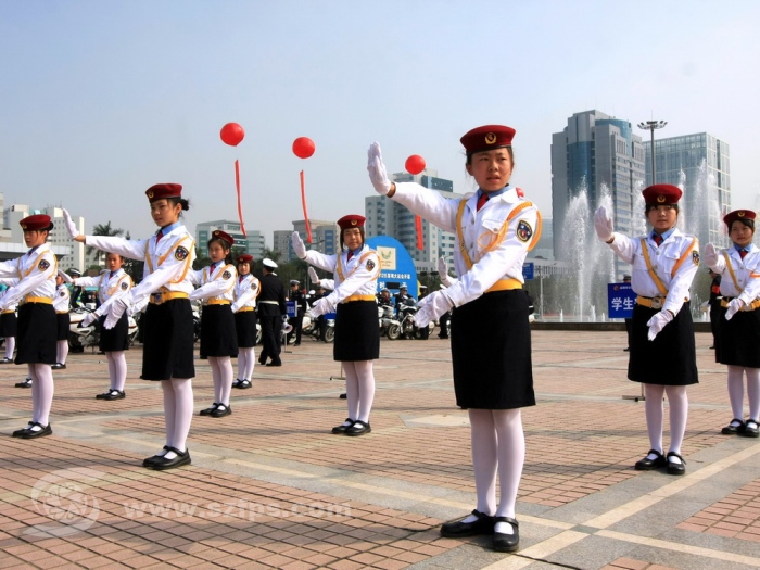 小交警在誓师大会上作交通指挥展演,展示了深圳小学生的精神面貌和文明风采