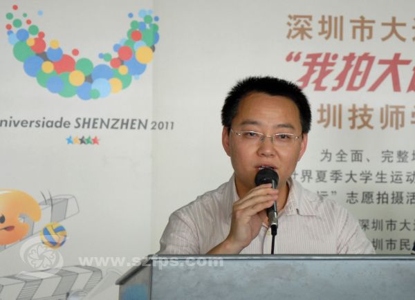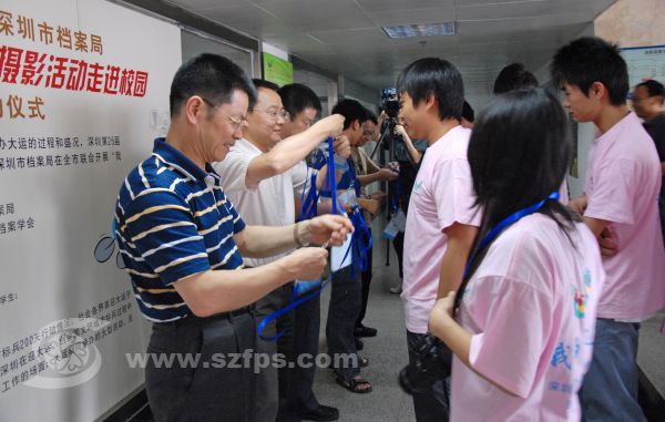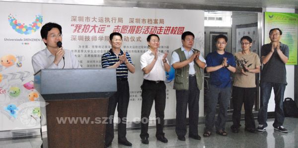 首先深大技师学院党委副书记李选昌发表讲话,接着,深圳市档案局崔处长和我学会刘会长先后致辞,最后深大技师学院的大运会志愿者代表朱洪波发表志愿感言。之后校方领导与来宾给学生们发“我拍大运”志愿者摄影证及T恤服,最后领导与师生们合影留念