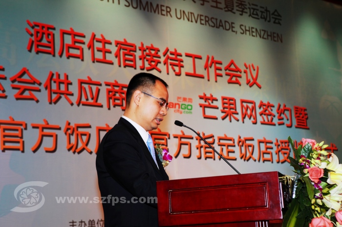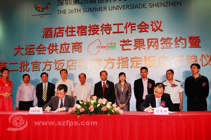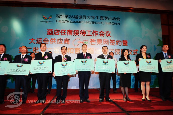 4月28日下午,深圳第26届世界大学生夏季运动会酒店住宿接待工作会议暨大运会供应商芒果网签约和第二批官方饭店和官方指定饭店在深圳授牌。大运会执委会副主席、执行局局长梁道行等嘉宾,为获选成为官方饭店和官方指定饭店的第二批25家饭店授牌。同时,大运会执行局与芒果网签订了大运会酒店及旅游预订服务类供应商合同。