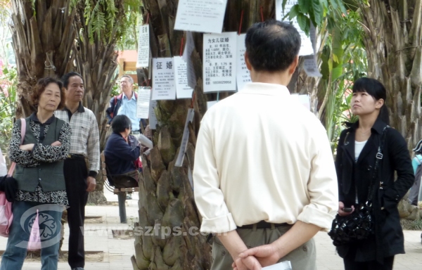 据说是从2005年起,莲花山公园南门附近那片约两三百平米的棕榈林就成了一个免费的“婚介角”,每逢周末,一批“月下老人”在此义务帮助未婚男女搭桥牵线,吸引不少牵挂儿女婚姻大事的老人或适婚男女大老远赶来,希望能给子女或自己找到一个理想归宿,深圳不少媒体都曾经报道过此事,也引起不少市民的浓厚兴趣。然而,随着这个本该“非诚勿扰”的月老之地影响越来越大,婚介婚托混迹其中骗取钱财,免费和公益渐成历史,百姓投诉、抱怨越来越多。