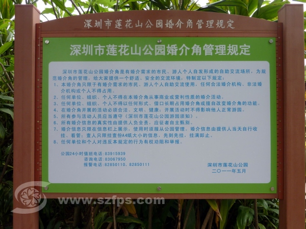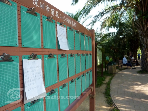 令人高兴的是,近日笔者看到莲花山公园管理处在这里竖起了几个“信息栏”,并制定了管理规定,看来是把婚介角纳入规范管理了。婚介角终于“找到组织”了,这的确是一件好事。但愿管理处能将好事办好,管好“信息栏”,发现有人收费立即驱逐,免得“树霸”变“栏霸”,害人更凶。另外,建议给这些信息栏加个顶棚,为游人留一个遮阳避雨之地。