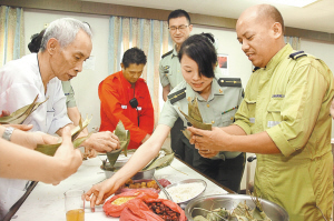 6月2日,东莞边检站的官兵和外籍船员一起包粽子。当日,广东省东莞边检站的官兵在例行对靠岸的外籍船舶进行检查后,为来自菲律宾、韩国等国的20多名船员送上粽子和黄酒,并与他们一道包粽子,让他们感受中国传统节日端午节的气氛。