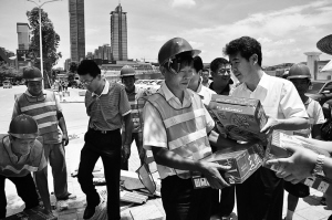 昨天,在福中路工地福田区委书记刘庆生搬起一箱饮料送到工人手中。 黄青山 摄