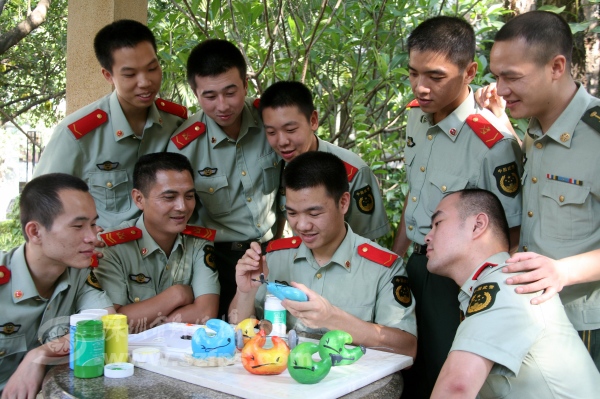 黎程远入伍之前曾经上过绘画班,有一定的美术基础,平时喜欢摆弄一些小玩意,渐渐的就掌握了捏泥塑的技巧。他说:“这5个“UU”吉祥物,不仅选择的是高级泥料,而且周边还要经过定型、雕刻、打磨、上色等七八个环节,花了一周时间才精心完成。”