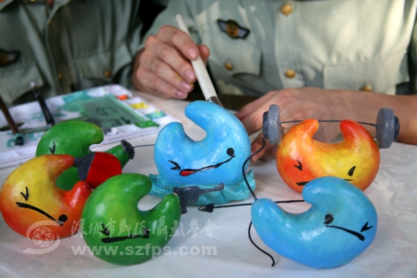 图为广东边防六支队战士黎程远用泥巴捏制深圳大运吉祥物“UU”。