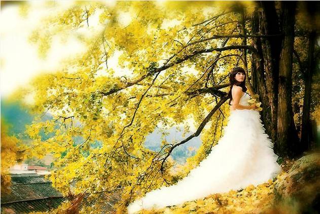 白色婚纱、金色杏林,这是两种浪漫色系在秋天的邂逅,素雅的色调、淡淡的地思绪,在这个只听得见风声的林间静静地任思绪走远。
