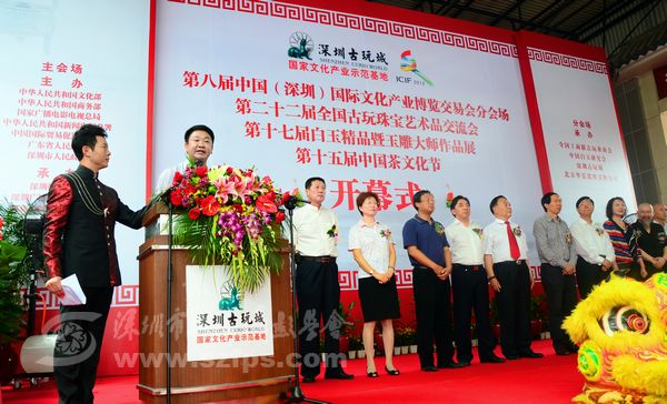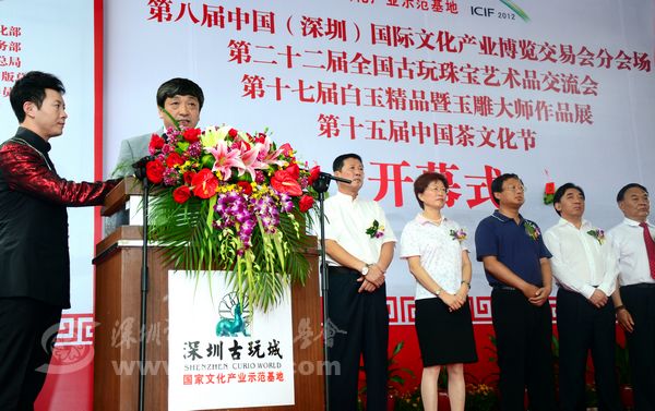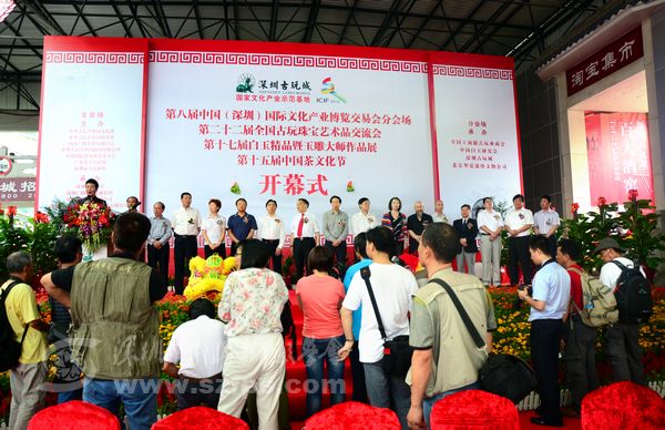 517上午1030分,第八届文博会深圳古玩城分会场暨第二十二届全国古玩珠宝艺术品交流会盛大开幕。出席开幕式的领导有国家文化部文化产业司司长刘玉珠,深圳市人大常委会常务副主任、深圳市委委员谭国箱,中国白玉研究会会长、北京西单天安天地国际珠宝城市场有限公司总策划、北京天宝润德古玩文物艺术会展中心有限公司董事长赵津生、深圳市文体旅游局副巡视员王敏、罗湖区委书记、区人大主任倪泽望等。