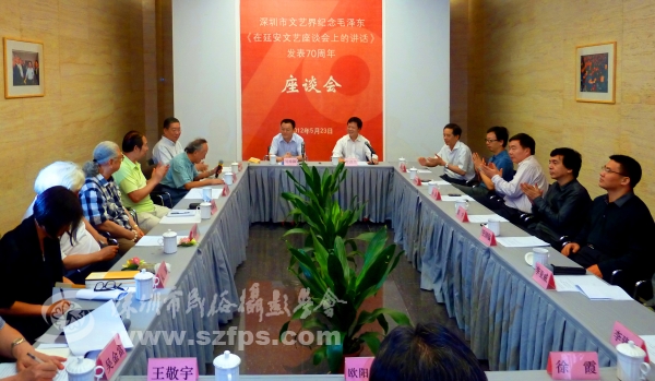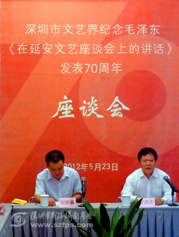 2012年5月23日下午,深圳市文艺界纪念毛泽东同志《在延安文艺座谈会上的讲话》发表70周年座谈会在关山月美术馆召开。深圳大学学术委员会副主任胡经之、深圳市优秀专家蒋开儒、广东省美术家协会副主席董小明、老艺术家谭嗣英、深圳市电影电视家协会常务副主席李亚威、深圳市戏剧家协会主席从容等深圳市文艺家代表出席。座谈会由深圳市文联党组书记、主席罗烈杰主持,专职副主席谢君心、冷炳冰、钱强、梁宇,深圳市委宣传部副部长、市文明办主任刘璋飙出席。