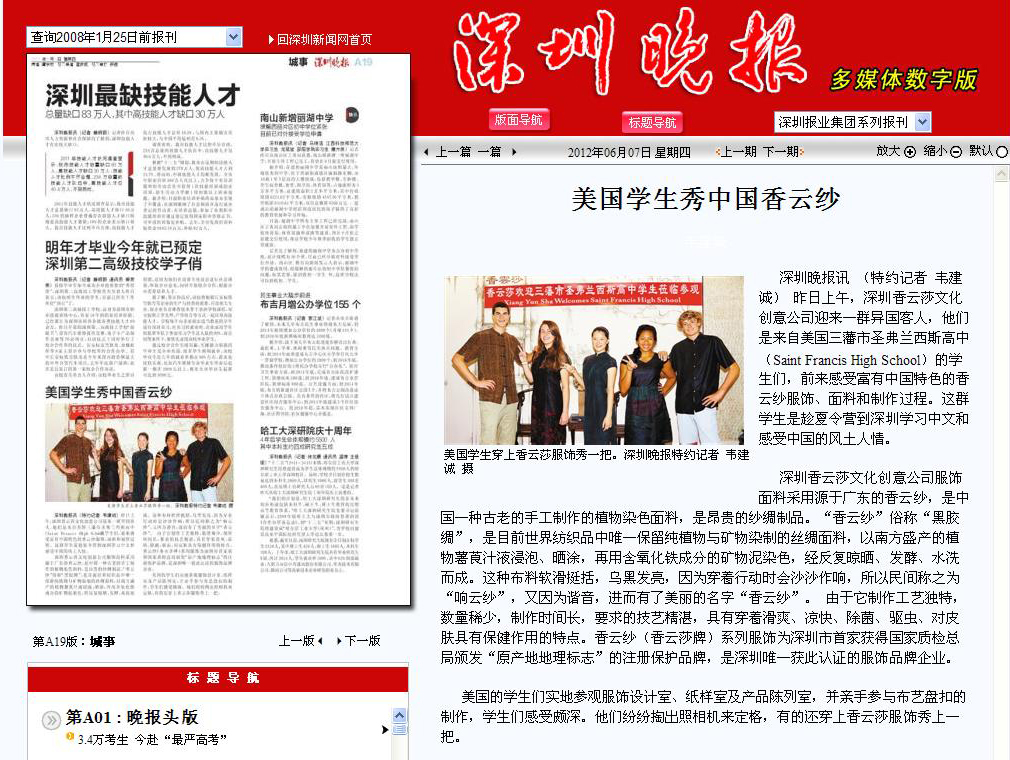 深圳晚报讯 (特约记者 韦建诚)2012年6月6日上午,深圳香云莎文化创意公司迎来一群异国客人,他们是来自美国三藩市圣弗兰西斯高中(Saint Francis High School)的学生们,前来感受富有中国特色的香云纱服饰、面料和制作过程。这群学生是趁夏令营到深圳学习中文和感受中国的风土人情。
