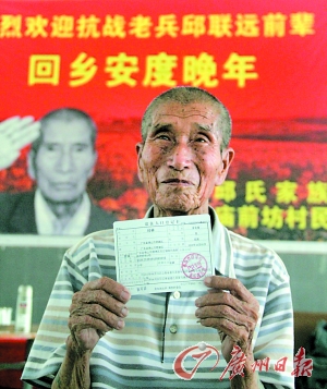 本报顺德讯 (记者曾毅摄影报道) 姓名“邱林”,出生地“广东省佛山市顺德区”,住址“顺德区龙江镇南坑南新路村前街1号”,昨日上午,顺利拿到顺德户籍的抗日远征军老兵邱联远喜不自禁,“60年了,又拿到顺德身份了!”