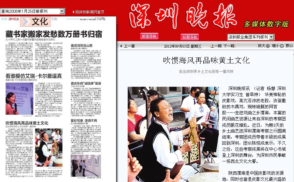深圳晚报讯 (记者 杨慧 深圳大学实习生 曾翠婷) 华美神秘的皮影戏,高亢苍凉的老腔,诙谐趣致的木偶戏,婉转细腻的阿宫腔……走进戏曲之乡渭南,丰富的民间曲艺资源让来自深圳的考察团成员眼花缭乱。近日,为期8天的乡土曲艺进深圳渭南考察之行圆满结束,考察团成员带着丰硕的成果回到深圳,团长陈悦成表示,不久之后,这些考察成果将在中心书城登上深圳的舞台,为深圳市民奉献一场西北文化大餐。
