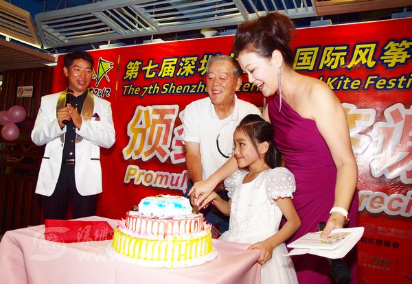 (台湾风筝协会阎清云与主持人一起切蛋糕)