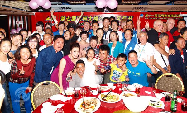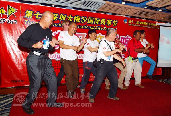 11月4日晚,主办方在芭堤雅酒店举办了颁奖及答谢晚宴上,盐田区委宣传部副部长李志利、深圳市风筝协会副会长杨军等领导为获奖的风筝队颁发了奖牌。晚宴上的小插曲是大家一起为八十八岁高龄的台湾风筝协会阎清云庆祝生日,三栖岛画苑的小朋友代表更是献上了诗歌朗诵以及萨克斯表演,博得了阵阵掌声。晚宴最后,由全场国际友人及领导嘉宾一起跳的《江南style》骑马舞更是将气氛推向高潮,在场领导、嘉宾、风筝运动员纷纷合影留念,共同祝愿大梅沙国际风筝节以后越办越好。