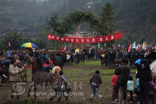 2012年11月6日,我们驱车来到牛场村,与水族人民共度端节。水族端节又称“借端”或“借瓜”,相当于汉族的春节,是以水历来推算过端日期。水乡山寨处处洋溢着节日的喜庆气氛,家家户户打扫得干干净净,人们忙着杀猪宰鸭,磨豆腐,开塘捉鱼等等一片繁忙,好不热闹。期间水族人民以赛马的方式庆祝端节。除夕之夜,各家各户忌荤吃素,主要进行庄重的祭祖仪式。祭祖仪式颇为讲究,在堂屋中设一供席,摆上鱼苞韭菜,素煮豆腐、糯米饭、瓜果等特色祭品,有的人家还摆放崭新的衣帽鞋袜以及柴刀、镰刀、锄头等生产生活用品,完毕后,一家老少围坐一团,由长者念颂先祖的功绩,然后供奉祖先,最后举杯相邀,连声“秀!秀!秀!”三声一饮而尽,以示对祖先的敬重和怀念。这天晚上,人们说笑相悦通宵达旦,各自小饮,整个村子灯火通明,铜鼓声声不悦于耳,直至天明。