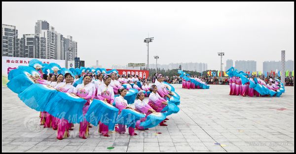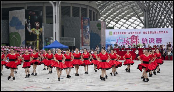 首先登场的南山区文化馆社团代表队带来的开场表演节目《欢庆的海湾》立刻把在场观众引入欢乐,振奋的气氛中。接下来的表演更是精彩纷呈,经过激烈的角逐,西丽街道代表队和蛇口街道代表队获得金奖。最后,气势宏大的900人方阵广场排舞《舞动南山》将活动推向了最高潮。