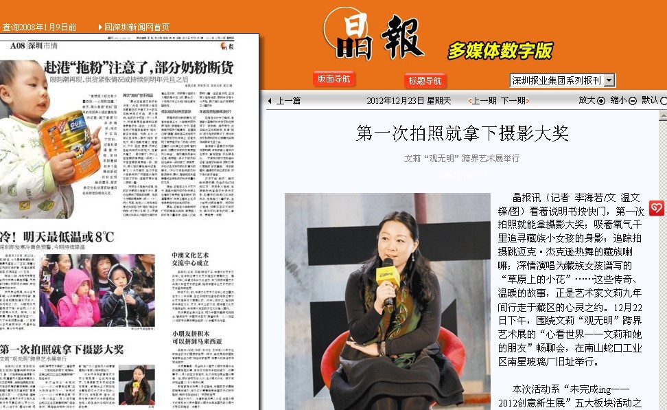 (记者 李海若/文 温文锋/图)看着说明书按快门,第一次拍照就能拿摄影大奖;吸着氧气千里追寻藏族小女孩的身影;追踪拍摄跳迈克·杰克逊热舞的藏族喇嘛;深情演唱为藏族女孩谱写的“草原上的小花”……这些传奇、温暖的故事,正是艺术家文莉九年间行走于藏区的心灵之约。12月22日下午,围绕文莉“观无明”跨界艺术展的“心看世界——文莉和她的朋友”畅聊会,在南山蛇口工业区南星玻璃厂旧址举行。