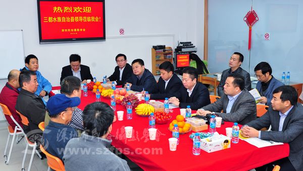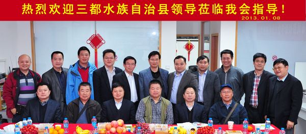 2013年1月8日上午,三都水族自治县领导莅临学会指导工作,并出席深圳市民俗摄影学会工作汇报座谈会。参加座谈会的嘉宾有三都水族自治县人大主任韦其贤,三都水族自治县政协主席韦成念,三都水族自治县县委常委、宣传部长覃友寿,三都水族自治县副县长高宏,中共三都水族自治县县委副调研员潘永行,三都水族自治县人民政府办公室主任潘利报,三都水族自治县政协秘书长唐合光,三都水族自治县教育局局长蒋志国,三都水族自治县鹏程希望学校校长韦国宏,三都水族自治县人民政府驻深办主任刘峻柏,深圳市投资控股公司党办办公室主任高建辉,深圳市民俗摄影学会会长刘对现,深圳市民俗摄影学会副会长汪秦生,深圳市民俗摄影学会常务理事叶植生,深圳市民俗摄影学会理事兼副秘书长李明,深圳市民俗摄影学会理事管洪涛,深圳市民俗摄影学会副秘书长郭飞,深圳市民俗摄影学会副秘书长李群,深圳市民俗摄影学会副秘书长薛志平等。