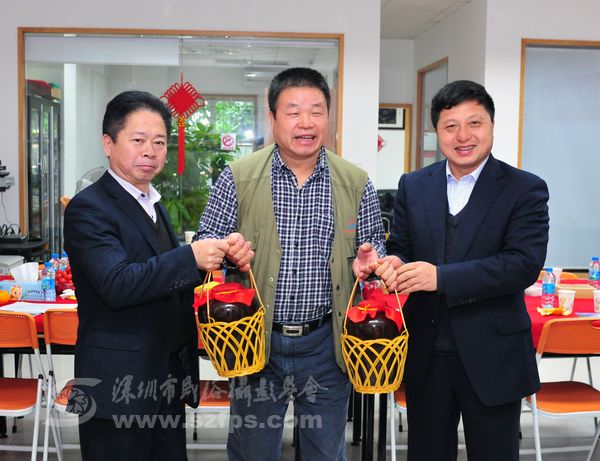 三都水族自治县人大主任韦其贤、三都水族自治县政协主席韦成念给深圳市摄影学会会长刘对现赠送三都特产九阡酒