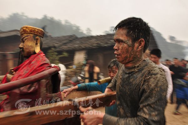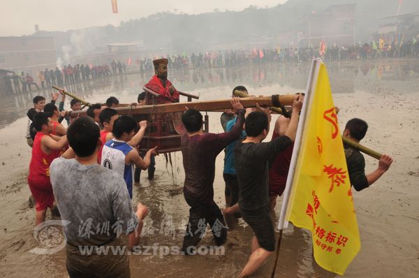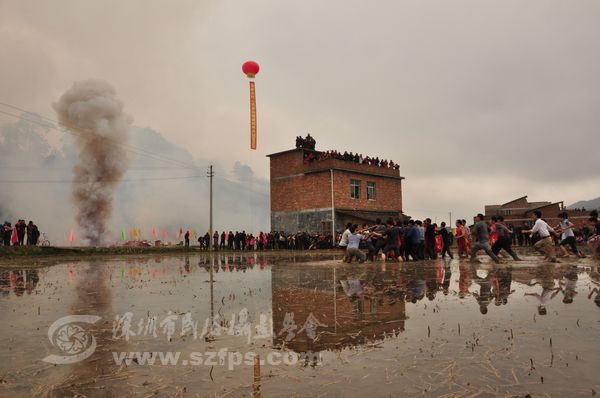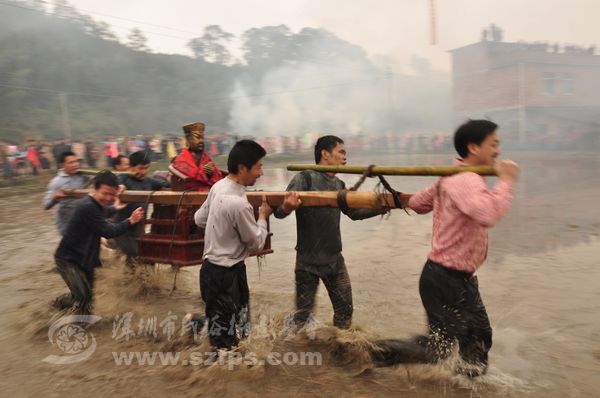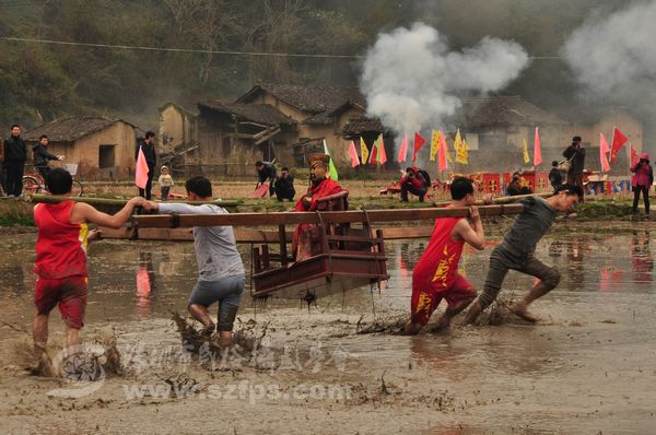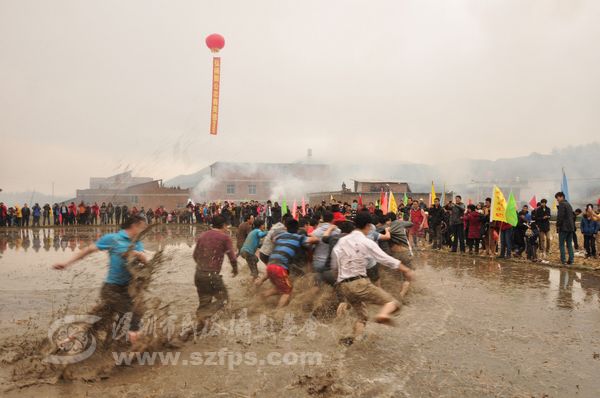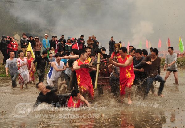 正月十二童坊镇举林村上演农村狂欢节“闹春田”。“闹春田”是汀州客家人春节期间的传统节目。年轻人抬着上百斤重的菩萨在泥田里奔跑、角力。