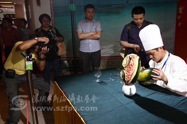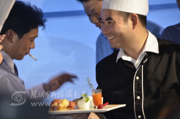 比赛的前奏则由一曲象征意义极浓的《春天的故事》而奏响,长廊上丰富的“厨界图片展”无不述说着厨界精英的盛世年华。此次大赛有“菜肴现场演示、蔬果雕刻表演、象生拼盘表演、西瓜雕刻表演、糖艺制作表演”等多项环节。灵活精致的西瓜雕刻吸引了众多拍摄者的镜头、栩栩如生的象生拼盘夺人眼球,蔬果糖艺的制作表演以呼之欲出的静态呈现在人眼前;而来自人称“魔鬼厨师”叶剑波的《双城虾之恋》、罗湖大自然国宴名厨柴进和的《野生松茸瓜青烩澳带》、斋菜名店静怡茶馆主厨陈池的《怡香五蕴皆空》的三道菜肴现场展示环节把整个比赛推至了顶峰。