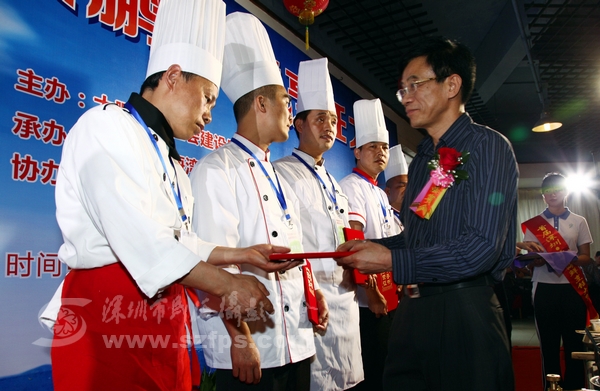 来自深圳市民俗摄影学会副秘书长、艾美饮食网经理、中国烹饪协会会员薛志平、“魔鬼厨师”叶剑波、国宴名厨柴进和、陈池、现场西瓜雕刻敖金金、祝家运、深圳市第二职业技术学校学生殷阿星、谢凯志等8获得此次技能大赛“个人表演贡献奖”。深圳市民俗摄影学会副秘书长、中国烹饪大师、餐饮业国家级评委彭昆,中国烹饪大师、餐饮业国家级评委麦世威、潘肈谐、欧阳海林等8人获得“优秀裁判奖”。深圳市迎宾馆、深圳市银湖昆记美食城等8家企业获得“企业表演贡献奖”。云海山庄、南澳星空馨语酒店、新地假日海湾酒店三家单位获得“优秀组织奖”。“优秀个人奖”的前三名大奖则由来自鹏海山庄的邓郁忠、东涌新豪方酒店朱新林、及钟深良三人囊获