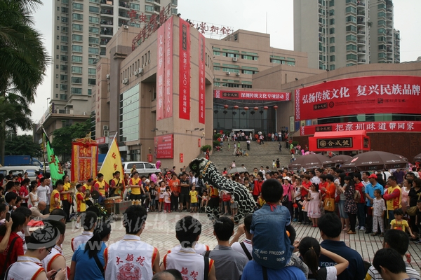 活动的主要有“采青祈福仪式、传统小食制作技艺展演互动、深圳民间传统文化艺术演出、深圳传统小食研发保护中心揭幕、民俗文化摄影大赛颁奖仪式、感恩授旗仪式及参观展览、传统民俗小食品尝分享会、《深圳民俗文化产业化发展》纱龙”等精彩内容,观赏者、拍摄者众多,广场上人山人海。中西方友好”互动旨意“不分国界祈和谐”。现场还有深圳的传统民间民俗歌舞与戏剧表演,尽显深圳传统民间民俗特有之风情。