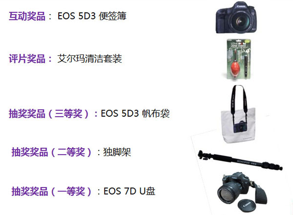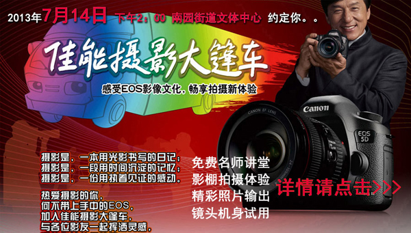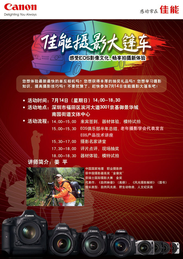现场点评的照片请发邮件到:szsdeos@163.com(标题请注明14号活动作品) 活动现场有照片打印体验,你若有需要请把打印的照片存到卡上带来吧,每人有免费打印一张照片的机会。 现场我们也安排了人像拍摄体验,将有n个优秀平面模特来到现场,来吧、来拍吧.... 现场我们安排了EOS和EF的全系列产品供你体验,最新的无敌三、独步天下的人像王镜头。 来吧,带着你的卡来试用吧。