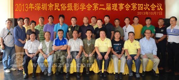 2013年10月7日中午,深圳市民俗摄影学会第二届理事会第四次会议在银湖旅游中心召开。会长刘对现,副会长汪秦生、马庆芳、苏顺清、陈卫国,常务理事叶植生,理事兼副秘书长叶小芳、赵肇军,理事戴会明、甘跃飞、黄福成、魏刚、冯志军、刘峻柏、吴榆、孔庆丽,副秘书长黄思浓、彭昆、郭飞、彭凯、彭广龙、彭建辉、李群、韩红、程劲晓、薛志平,深圳市委宣传部文艺处处长何良、香港中国旅游出版社编辑部副主任黄焱红及驻会工作人员共33人欢聚一堂。深圳市银湖旅游中心翠谷楼总经理、我学会副秘书长彭昆为此次理事会提供了场地和美食。