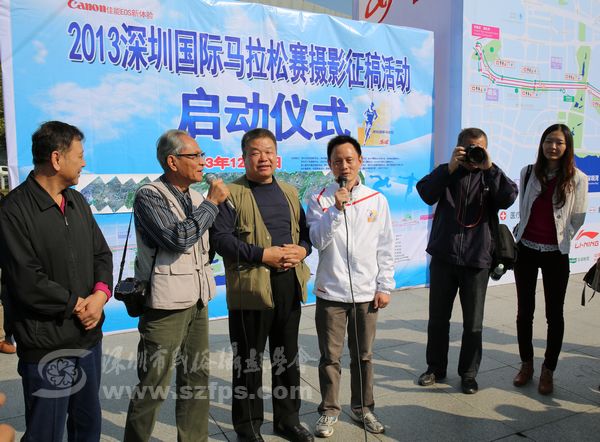 启动仪式由深圳市民俗摄影学会副秘书长李群主持。随后,深圳国际马拉松赛组委会宣传部孙乾芳部长简单介绍了本届马拉松赛事的概况,并表示希望报名的摄影师能利用手中的相机创作容丰富、精彩的作品。之后,深圳市民俗摄影学会会长刘对现激动地表达了对本次摄影征稿活动的期许,希望摄影师用相机将瞬间、动态的运动场景以永恒、静态的影像形式表达出来,也为了传播深圳的精彩和运动健康的生活理念,让更多喜爱摄影的市民朋友参与到这样一场国际的体育赛事当中来。最后,深圳国际马拉松赛组委会宣传部部长孙乾芳,佳能(中国)深圳分公司李阳,深圳市老年摄影学会会长张之先,我学会会长刘对现一起宣布了2013深圳国际马拉松赛摄影征稿活动启动仪式启动!